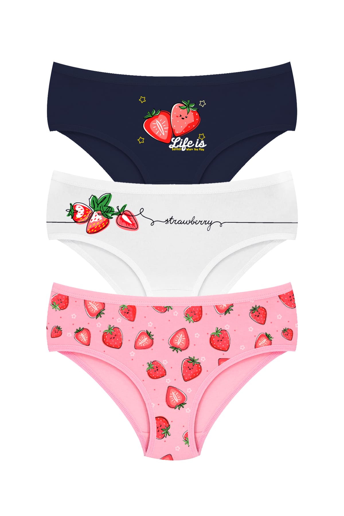 Farklı renk seçenekleri ile sunulan bu külot, her türlü üst giyim ile kolayca kombinlenebilir. Hem okulda hem de evde günlük kullanım için ideal olan bu ürün, rahatlığı ve şıklığı bir araya getirir. Çilek baskılı tasarımı sayesinde, çocuğunuzun gardırobuna renk katacak bir detay sunar.