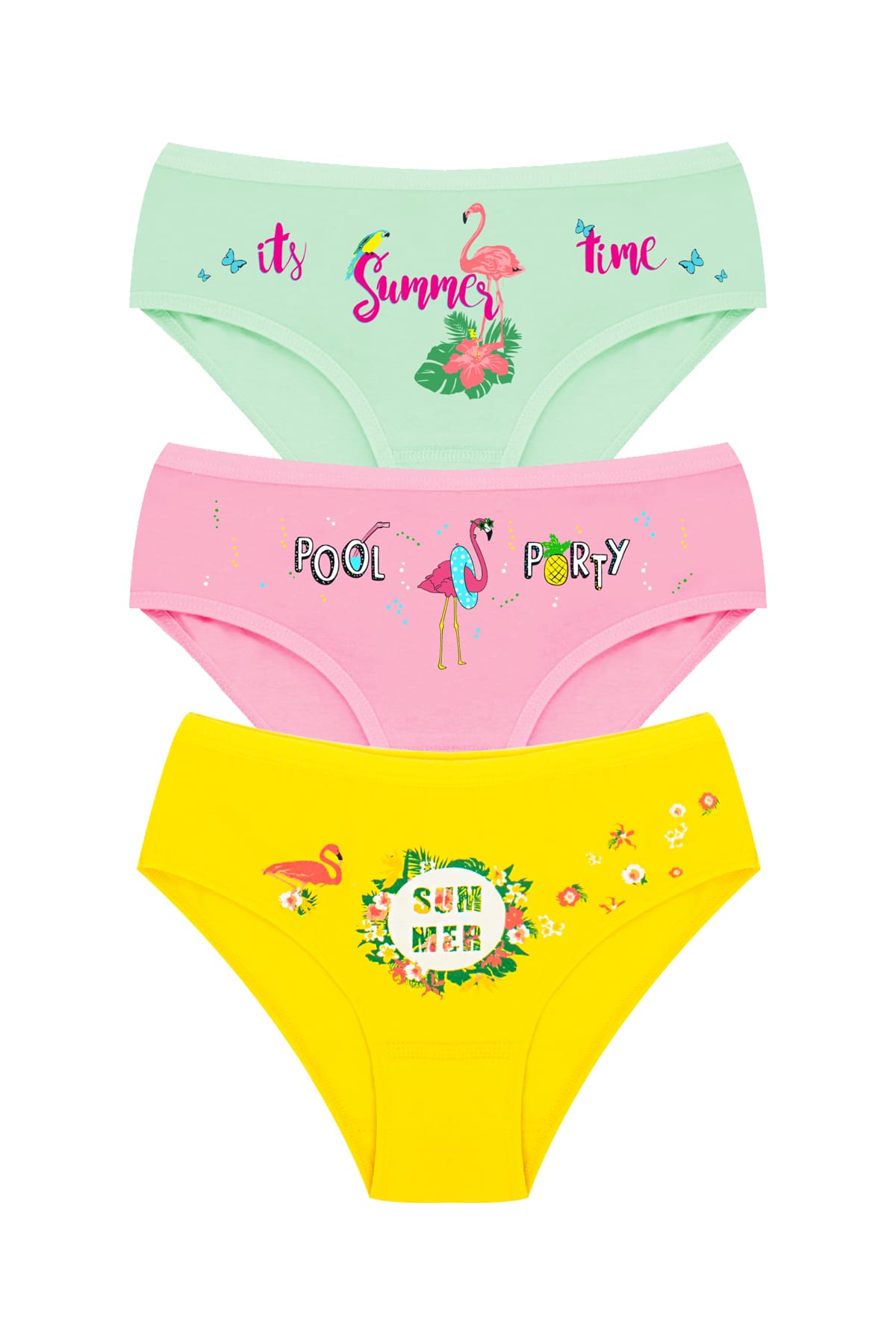 Sarı, yeşil ve pembe renklerde, yumuşak dokulu, %100 pamuklu kız çocuk külotu. %96 Pamuk, %4 Elastan