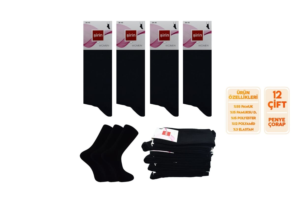 Siyah tonlarında, 12'li pakette sunulan penye kadın çorap. Dayanıklı yapısı ve esnek bel bandı ile konfor sağlar.