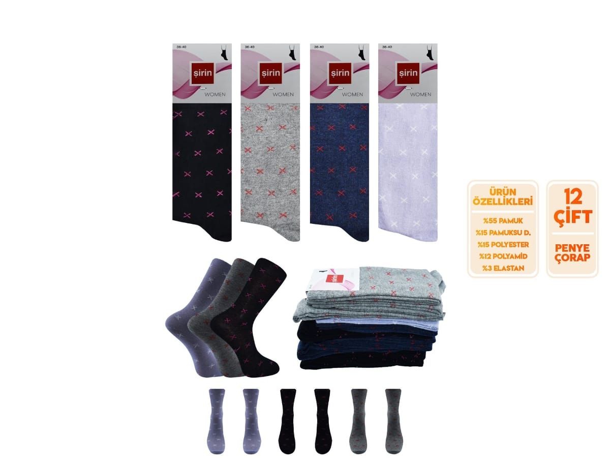 Mor tonlarında, 12'li paket içeriği ile sunulan penye kadın çoraplar, günlük giyimde konforu arttırır.
