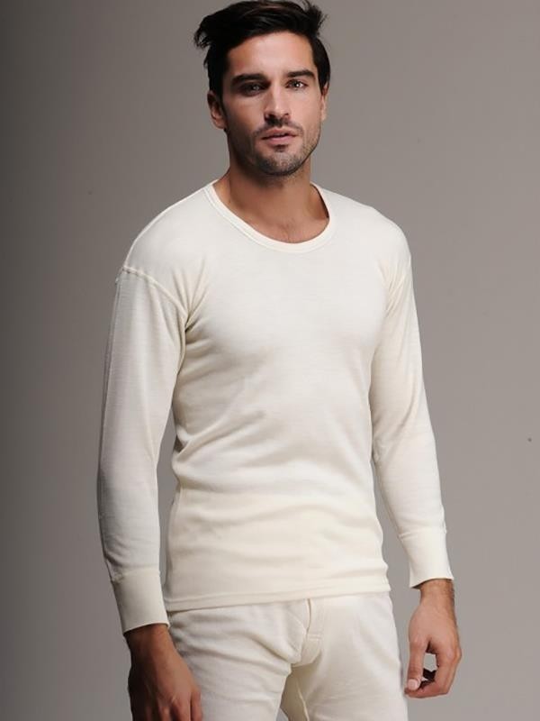 Ekru renkli, Avustralya Merinos yünü ve akrilik karışımından üretilmiş uzun kol fanila. %75 Avusturalya Merinos Yünü, %25 Akrilik