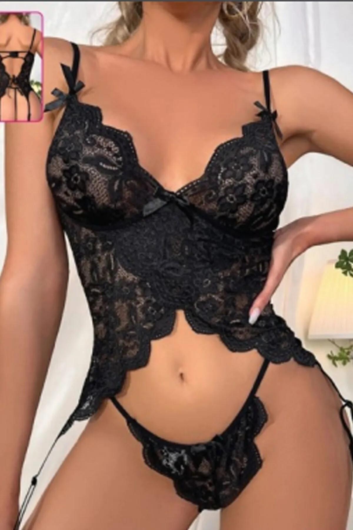 Siyah renkli, arkadan bağcıklı jartiyer takımı, esnek doku ve ayarlanabilir klipslerle tasarlandı.
