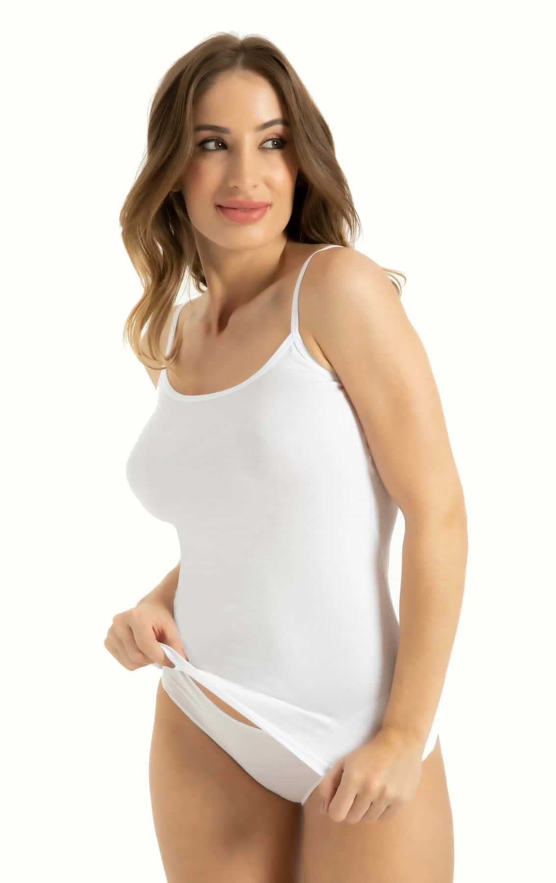 Beyaz, siyah ve somon renk seçenekleri ile şık bir görünüm sunan, ip askılı bambu atlet. %95 Bambu, %5 Elastan