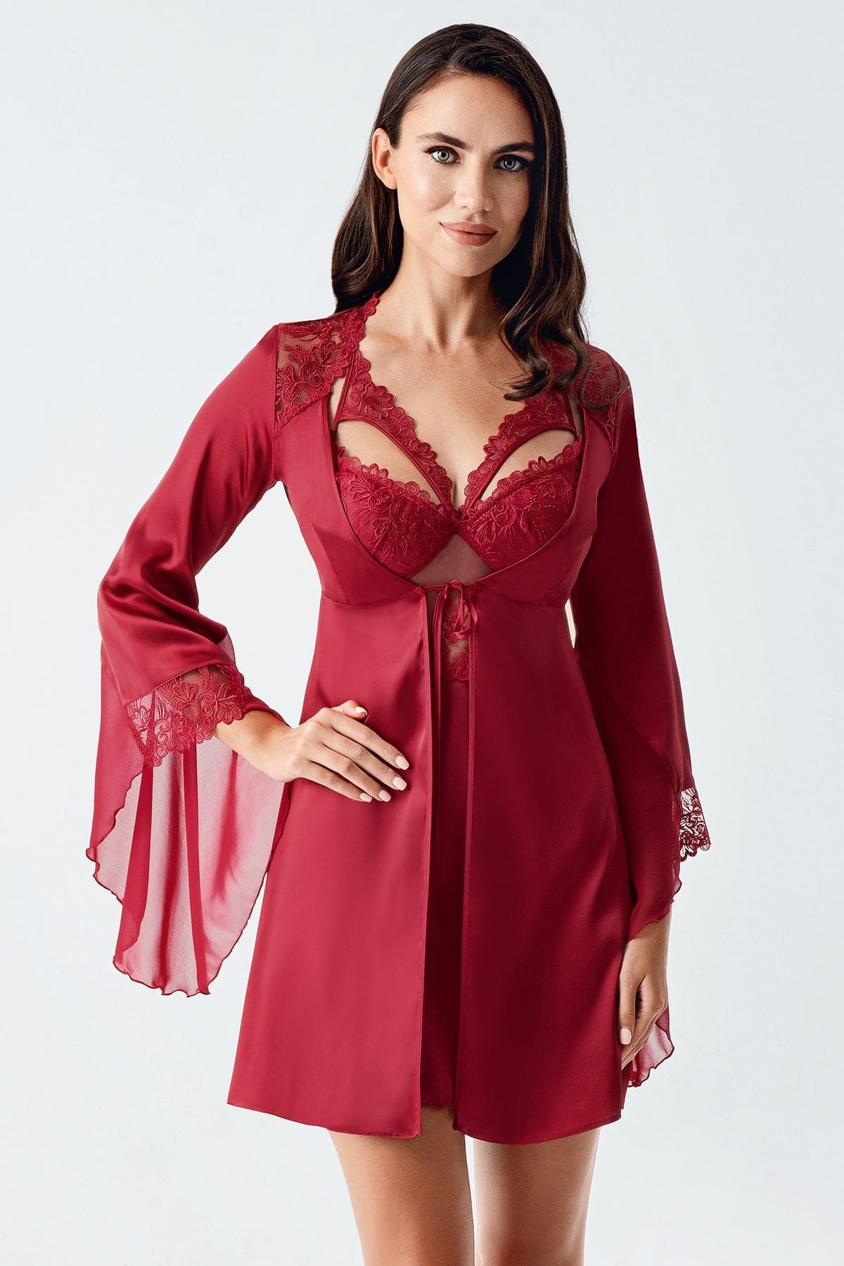 Bordo renk tonundaki saten gecelik takım, dantel detaylarıyla zarif bir görünüm sunuyor.