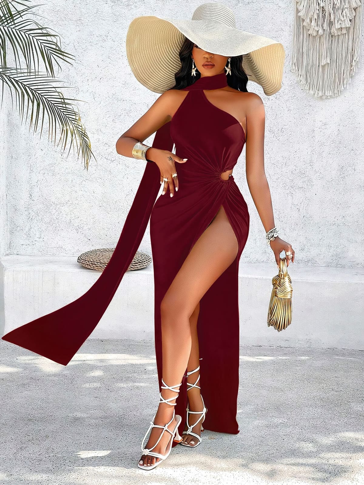 Bordo tonu ile dikkat çeken uzun elbise, hafif kumaşı ve şık yırtmaç detaylarıyla göz alıcı bir görünüm sunuyor.