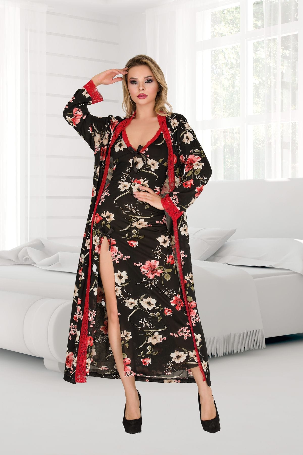 Büyük beden çiçekli uzun yırtmaçlı gecelik, özellikle rahatlığı ve şıklığı bir araya getiren bir tasarıma sahip. Somon rengi, sıcak bir hava katarken, çiçek desenleri de romantik bir dokunuş sunuyor. Bu gecelik, evde geçirdiğiniz zamanlarda kendinizi özel hissetmenizi sağlarken, aynı zamanda konforlu bir uyku deneyimi sunar. Uzun yırtmaç detayı ise hareket özgürlüğü sağlarken, aynı zamanda şık bir görünüm oluşturuyor.