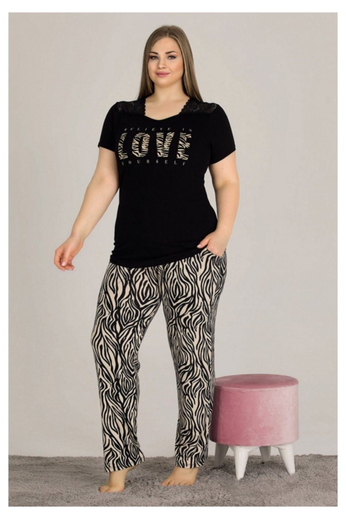 Siyah rengi, her zaman şık ve zarif bir görünüm sunar. Modern bir duruşu olan bu pijama takımı, evde misafir karşılarken veya uykudan önceki rahat anlarınızda sizi iyi hissettirir. Kesim rahatlığı sayesinde, vücut hatlarınızı nazikçe sararken, esnek yapısı ile her bedene uyum sağlar. Aynı zamanda, şıklığı ve rahatlığı bir arada sunarak, dolabınızdaki diğer parçalarla da kolayca kombinlenebilir.