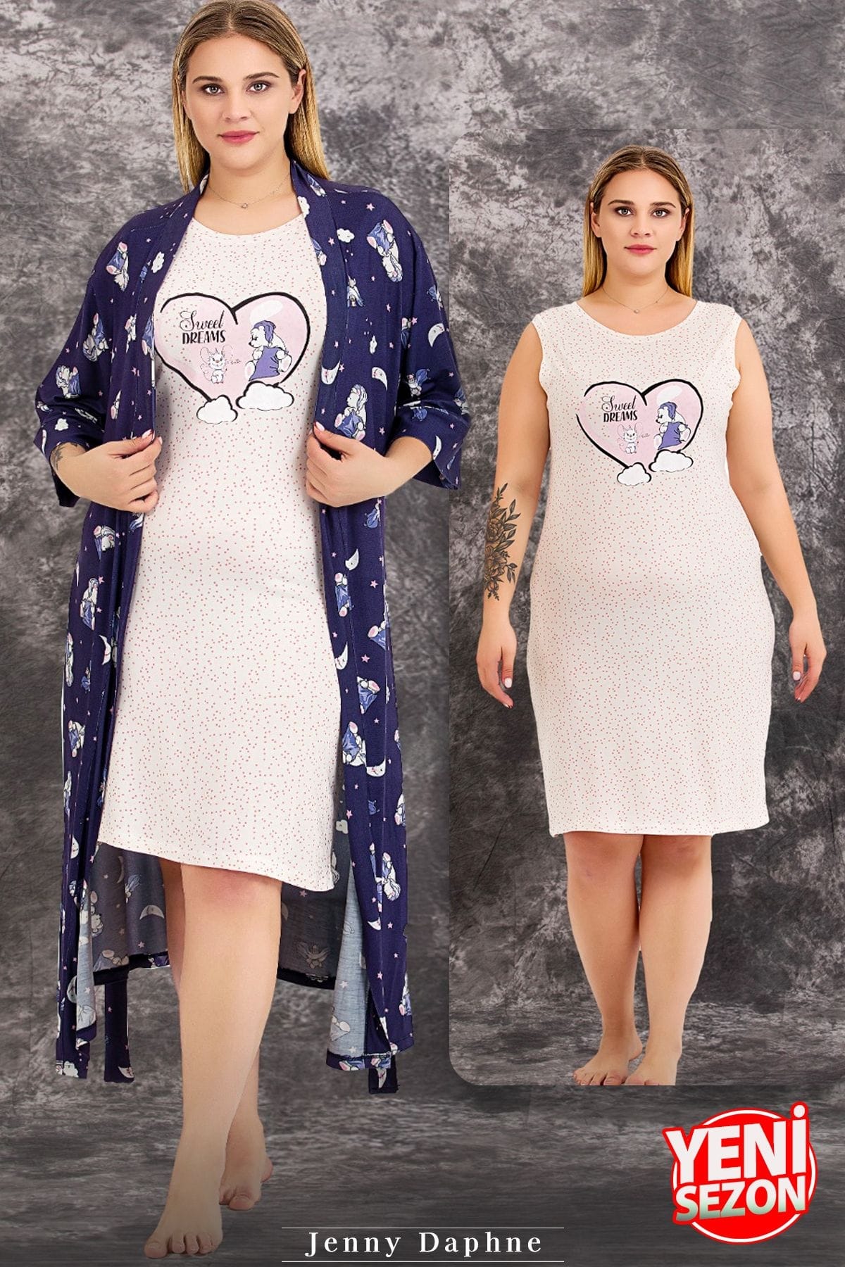 Büyük beden lacivert 2li gecelik ve sabahlık takımı, evde geçireceğiniz zamanları daha konforlu hale getirmek için tasarlandı. Yumuşak dokusu cildinizle uyum sağlarken, rahat kesimi vücut hatlarınızı zarif bir şekilde sararak özgür bir hareket alanı sunuyor. Gecelik ve sabahlık, şık bir kombin oluşturarak evde misafirlerinizi karşılarken bile stil sahibi olmanızı sağlıyor.