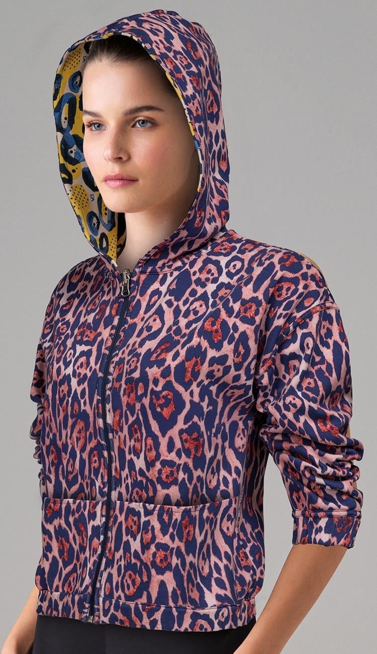 Mor tonlarında, çift taraflı kapüşonlu, desenli kadin mont. Yumuşak dokusu ile konforlu bir kullanım sunar.