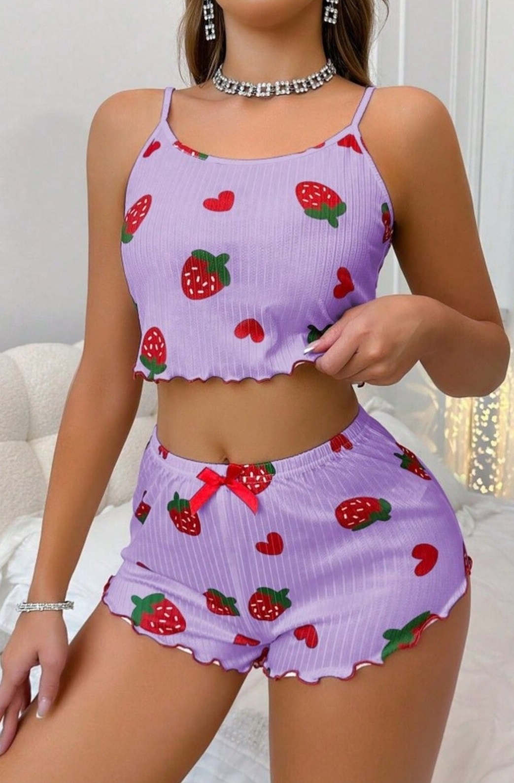 Lila tonlarında, çilek ve kalp desenli, yumuşak dokulu şortlu pijama takımı.