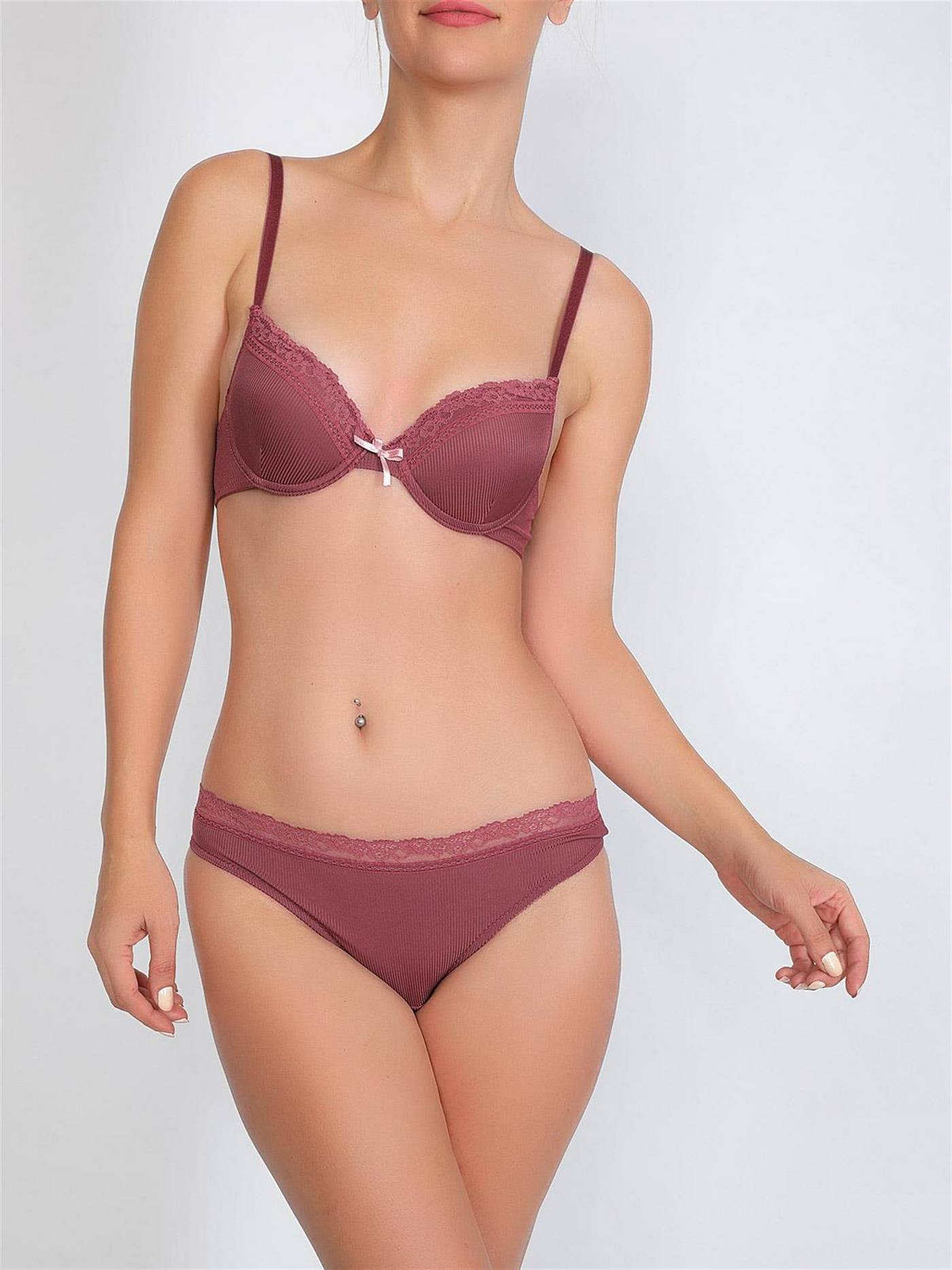 Somon ve gül kurusu renk seçeneklerine sahip, dantel detaylı destekli sütyen ve uyumlu bikini külot takımı.