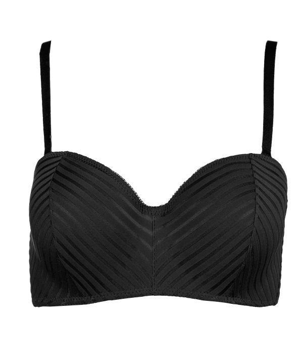 Siyah renk tonunda, elastik dantel detaylarıyla tasarlanmış desteksiz straplez sütyen, zarif bir görünüm sunuyor.