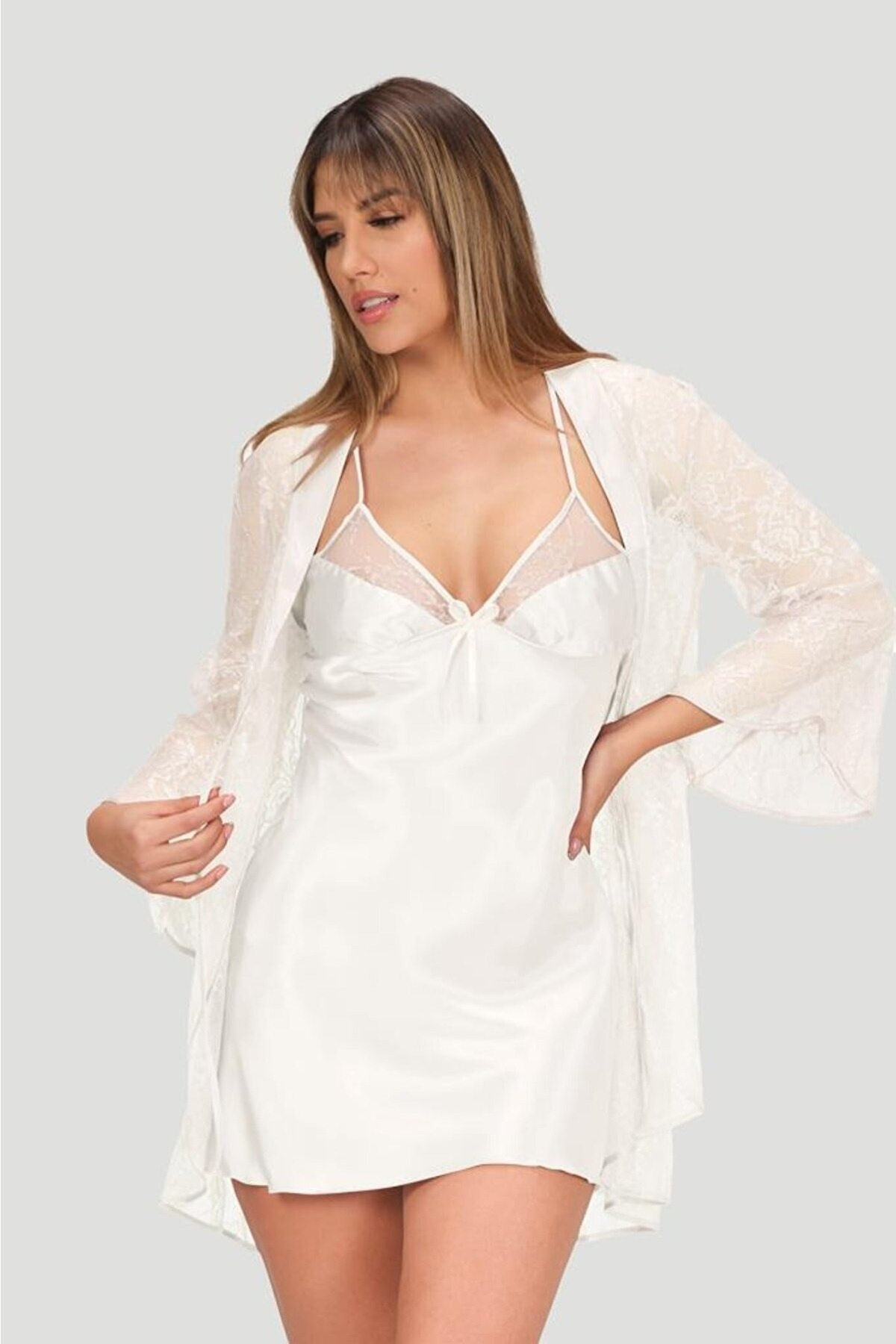 Ekru renkte, dantel detaylı ve kısa kesim saten gecelik ve sabahlık takım.