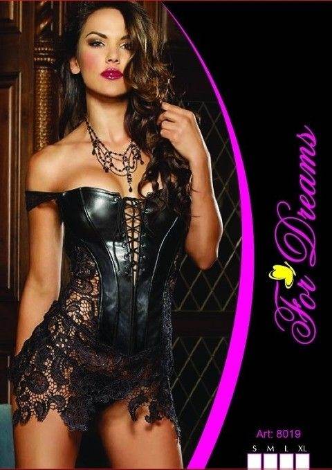 Siyah dantel ve deriden oluşan, sırtı fermuarlı fantezi giyim. Çapraz bağlama detayı ile şıklık sunuyor. %85 Polyester, %15 Elastan