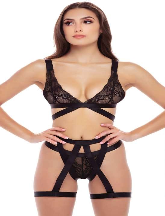 Siyah dantel detayları ve jartiyer bağlantıları ile tasarlanmış, zarif bir görünüm sunan set.