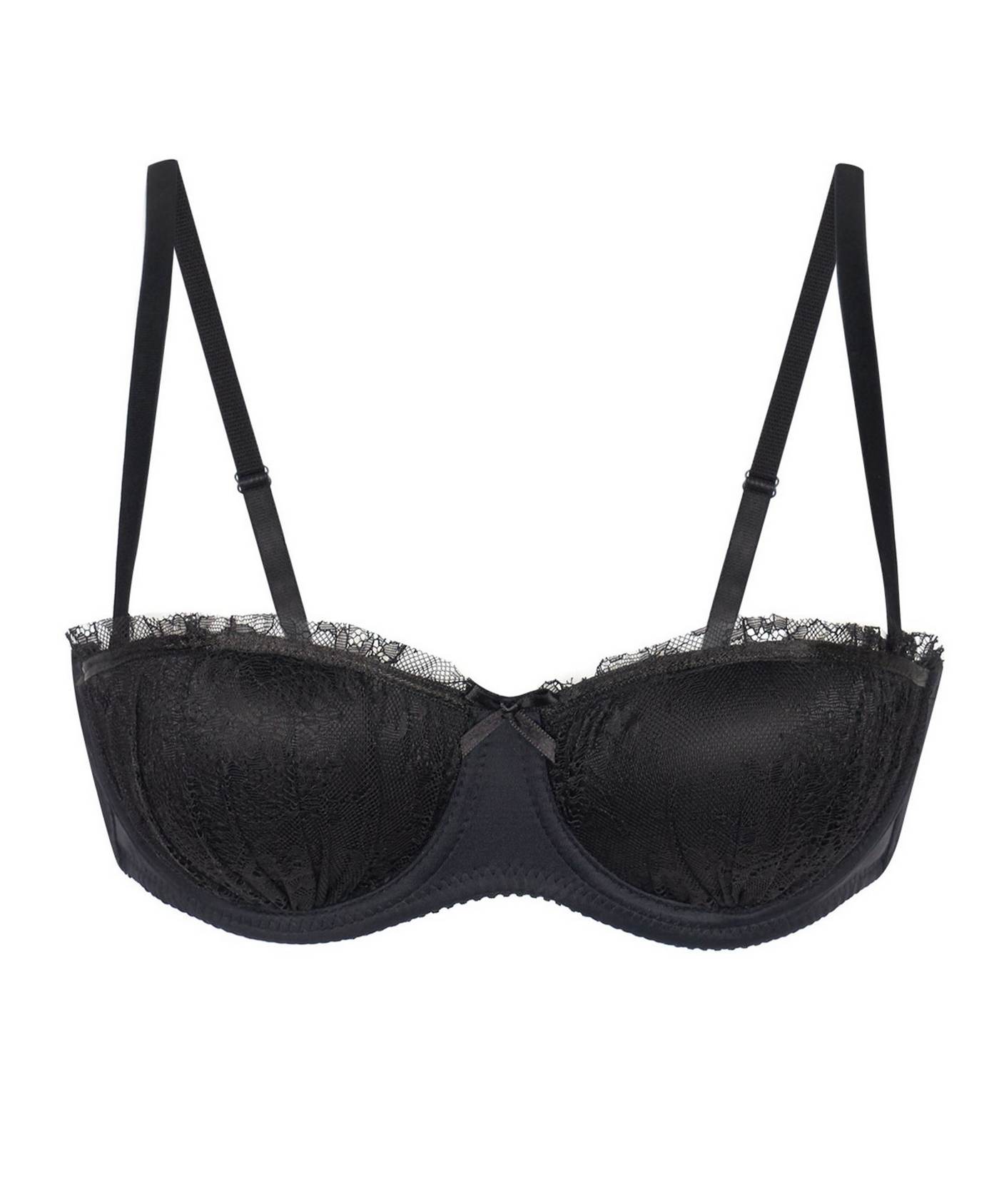 Siyah renkli, elastik dantel detaylarla süslenmiş straplez sütyen. İnce yapısı ile hafif bir his sunuyor.