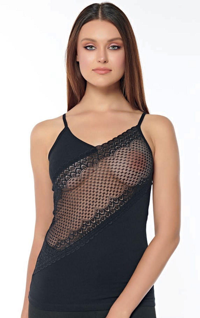 Siyah dantel detaylarıyla süslü, ince askılı pamuklu kadın atlet. Yumuşak dokusu ve hafif yapısıyla gün boyu konfor sağlar. %92 Pamuk, %8 Lycra