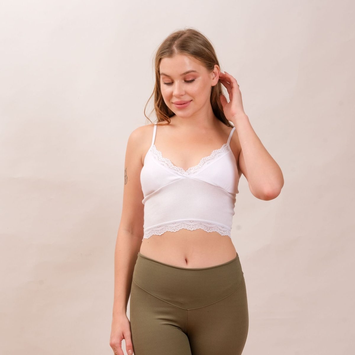 V yaka dantel kenarı ve alt bant dantel şeridiyle tamamlanan ince askılı pedli kadın crop top.