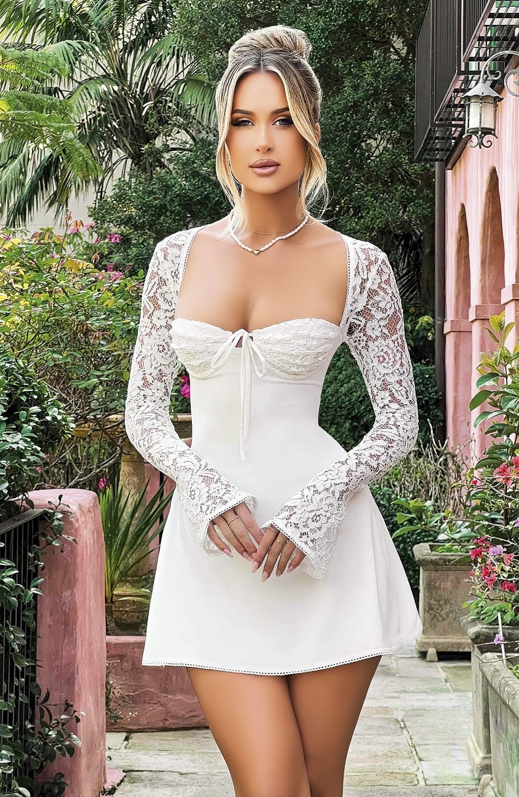 Beyaz dantel kol detaylarıyla zarif bir midi elbise. Vücut hatlarını vurgulayan dekolte kesim.