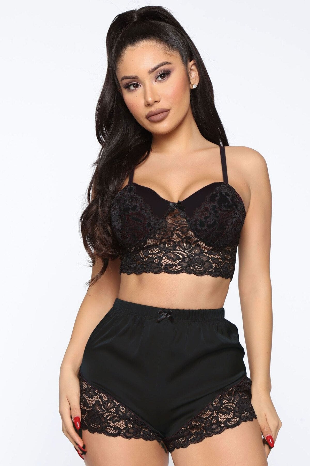 Somon renginde, dantel detaylı askılı saten sütyen ve şort takımından oluşmaktadır. Yumuşak dokusu ve şık tasarımıyla göz alıcı.