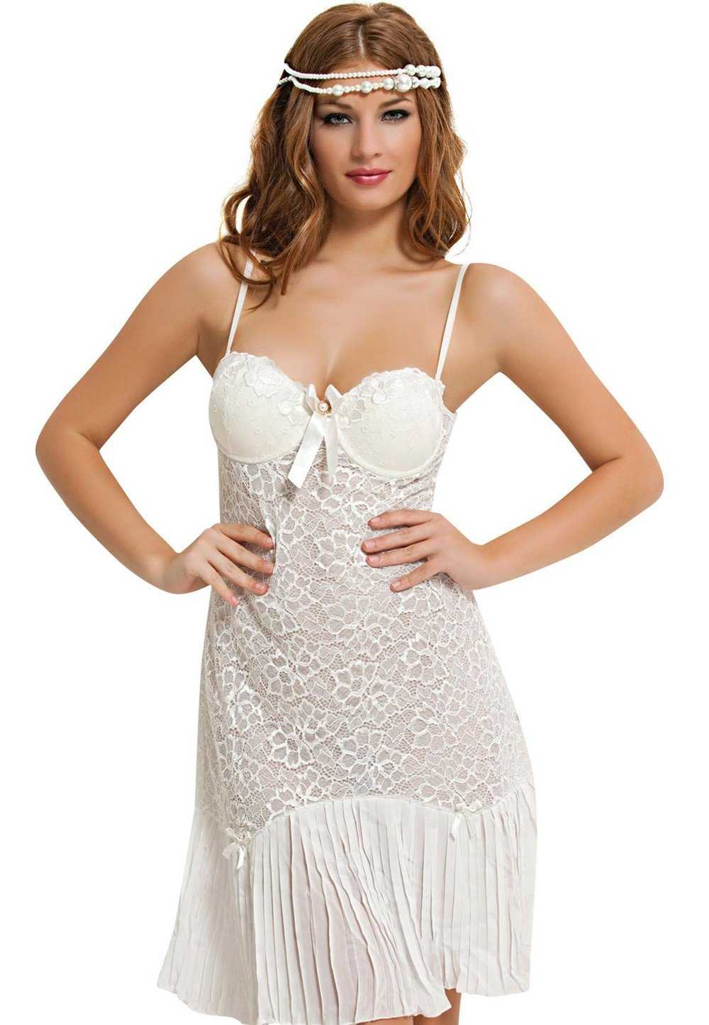 Ekru rengindeki dantel detaylı gecelik, hafif tül etekle zarif bir görünüm sunuyor.