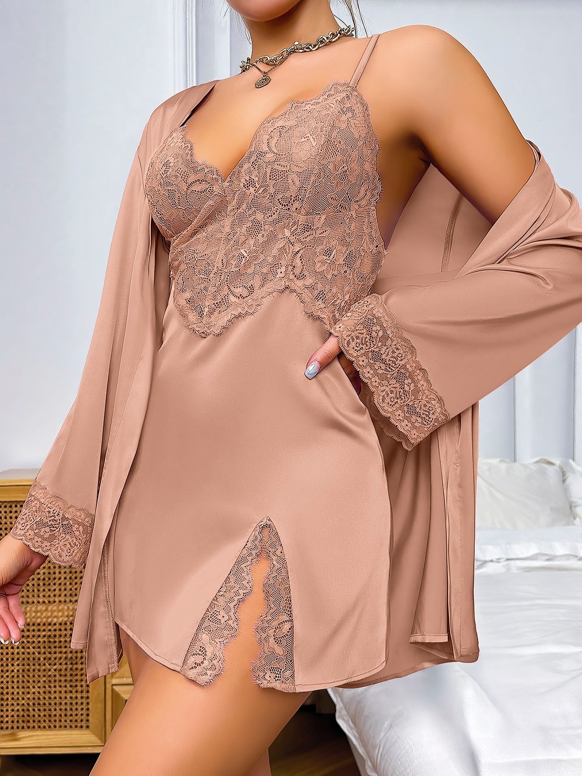 Dantelli ince askılı uzun kollu sabahlık ve gecelik takımı, şık ve rahat bir uyku deneyimi sunuyor. Ürün, %100 polyester kumaş yapısıyla hem hafif hem de dayanıklıdır. Bu kumaş, vücudu sararak hareket özgürlüğü tanırken, aynı zamanda nefes alabilir özellikleri sayesinde gece boyunca konfor sağlar.