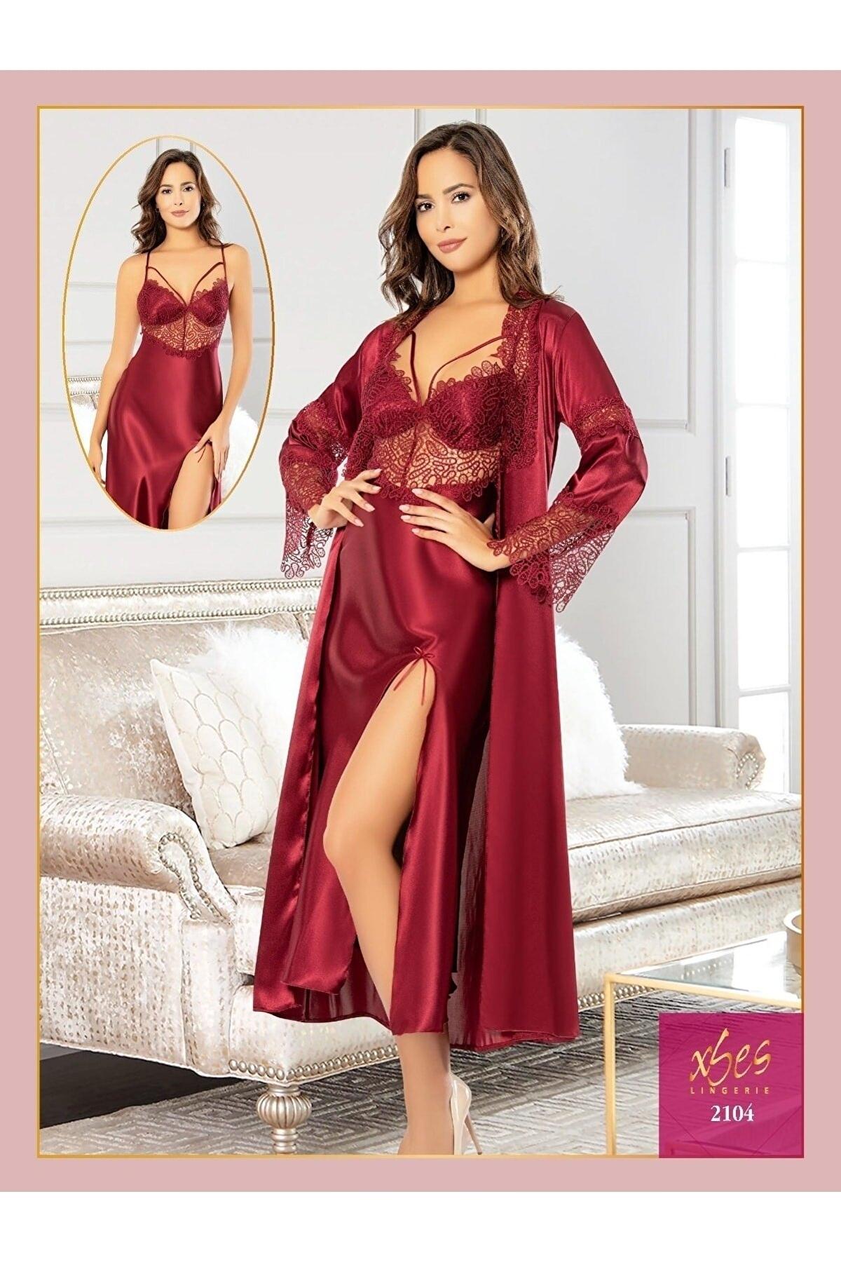 Pembe tonlarında, derin yırtmaç detayına sahip saten gecelik ve uyumlu sabahlıktan oluşan zarif set.