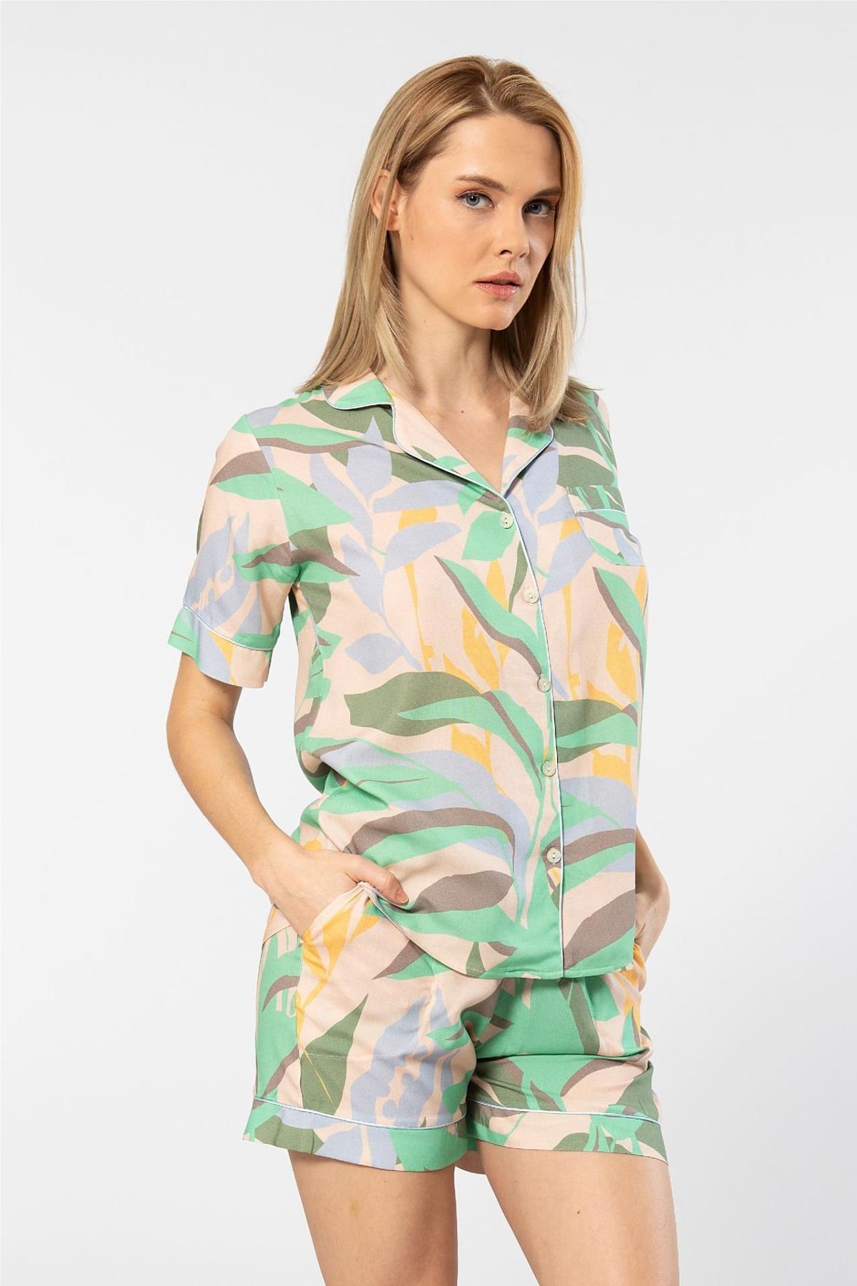 Yeşil tonlarındaki desen, sıcak yaz günlerinin ferahlığını yansıtırken, evde geçirdiğiniz zamanları daha keyifli hale getiriyor. Mevsimlik kumaşı sayesinde, her mevsimde rahatlıkla giyebilirsiniz. Ayrıca, bu takımın bakımı son derece kolaydır; çamaşır makinesinde yıkanabilir. Hem şıklığı hem de pratikliği bir arada sunarak, günlük yaşamınıza zarif bir dokunuş katıyor.