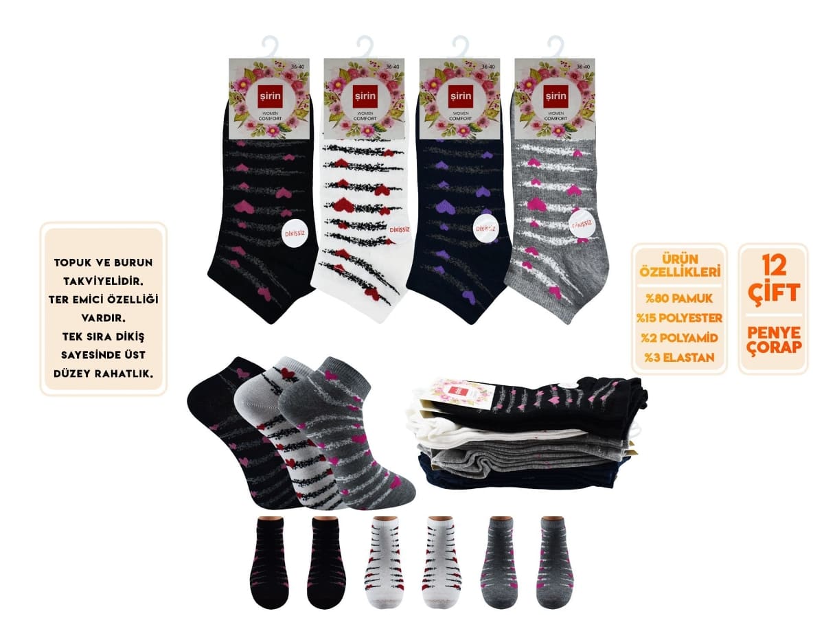 12'li set halinde sunulması, hem ekonomik bir seçenek oluşturuyor hem de dolabınızda her zaman bulundurabileceğiniz pratik bir yardımcı haline getiriyor. Yüksek dayanıklılığı ile uzun süreli kullanımlarda dahi formunu koruyan bu çoraplar, günlük giyiminizi tamamlayacak ve her adımda rahatlık sunacaktır. Farklı kombinlerinizle rahatça kullanabileceğiniz bu dikişsiz çoraplar, her kadının gardırobunda yer almayı hak ediyor.