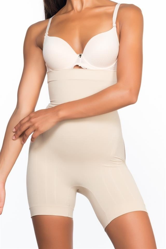 Siyah renkte, dikişsiz yapıya sahip yüksek bel korse. Popo açık tasarım, konforlu bir kullanım sunuyor.