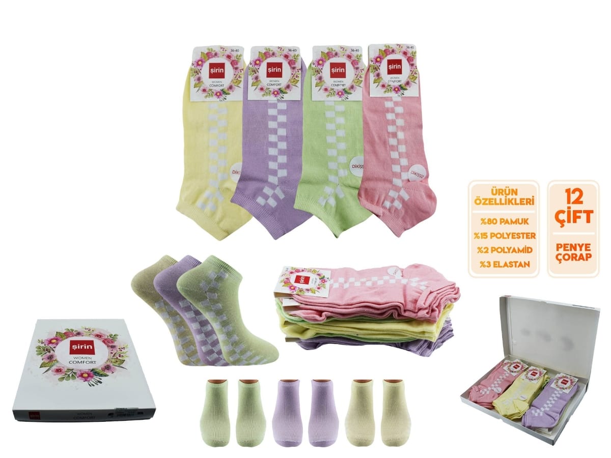 Dikişsiz bayan penye patik çorap seti, 12'li paketiyle günlük yaşamda aradığınız konforu sunuyor. Mor tonlarındaki çoraplar, her türlü kıyafetle rahatlıkla kombinlenebilir. Dikişsiz tasarım, ayağınızda rahatsızlık hissi yaratmadan giyilmesine olanak tanır. Gün boyunca rahat bir deneyim sunarak, ofiste ya da evde geçirdiğiniz saatleri daha keyifli hale getirir.