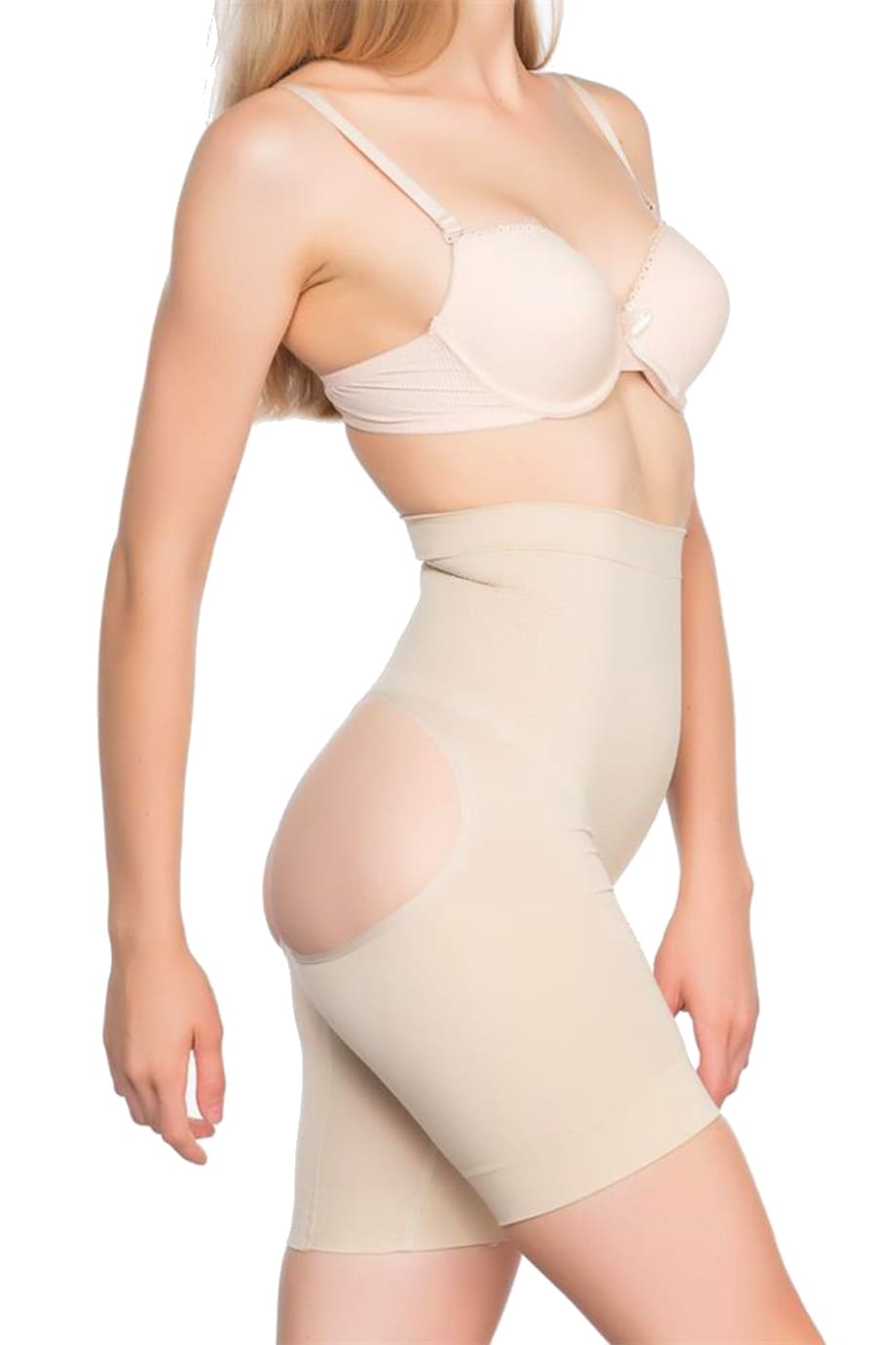 Beyaz, siyah ve somon renk seçenekleriyle sunulan dikişsiz yüksek bel korse, popo açık paça tasarımıyla dikkat çekiyor. %88 Microfiber Polyamid, %12 Elastan