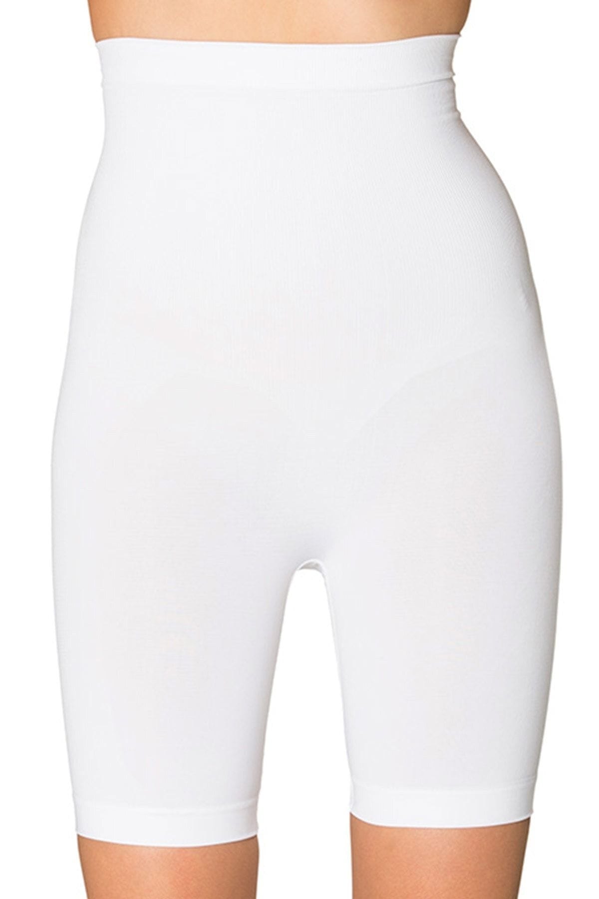 Beyaz renk ve dikişsiz tasarıma sahip uzun paçalı korse, vücut hatlarını düzeltir.