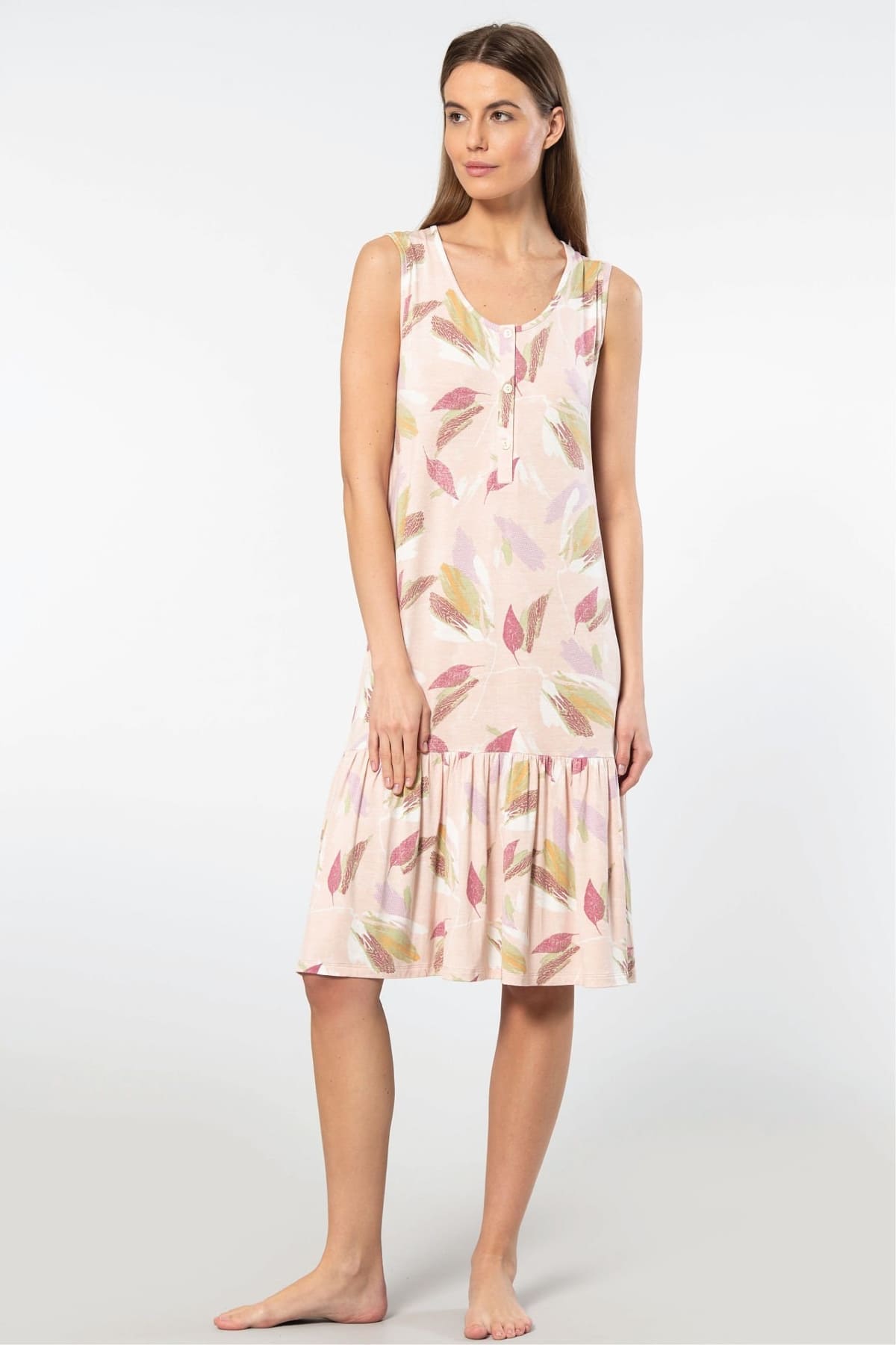 Siyah-gri desenli, düğmeli askılı midi boy gecelik, yumuşak viskon kumaşıyla konfor sunar. %95 Viskon, %5 Elastan