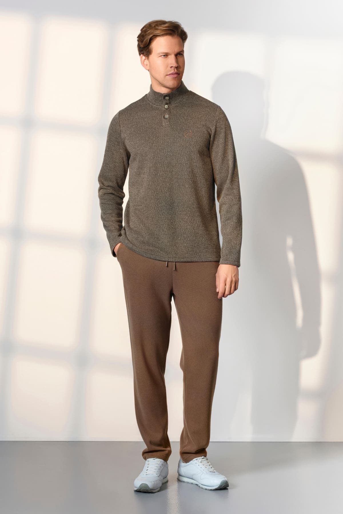 Kahverengi tonları, şıklığı ve sade bir görünümü bir araya getirir. Bu pijama takımı, hafif yapısıyla ev giyimi için mükemmel bir katman oluşturur. Düğmeli dik yaka ise hem şık bir görünüm sunar hem de esnek bir şekilde vücuda uyum sağlar. Bu sayede, kıyafetinizi rahatlıkla günlük hayatta kullanabilirsiniz.