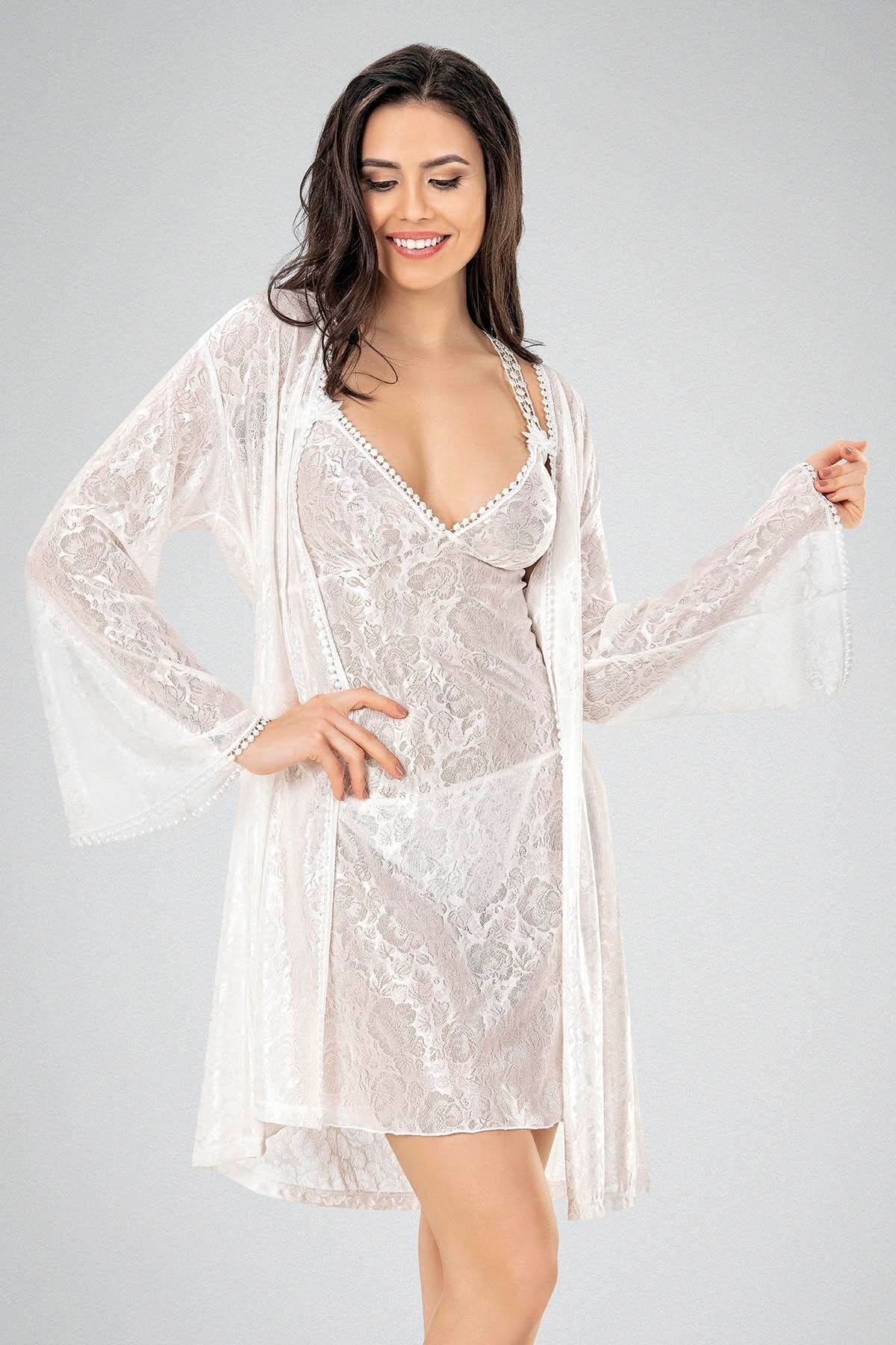 Ekru tül detayları olan, hafif ve şık bir sabahlık ve gecelik takımından oluşmaktadır.