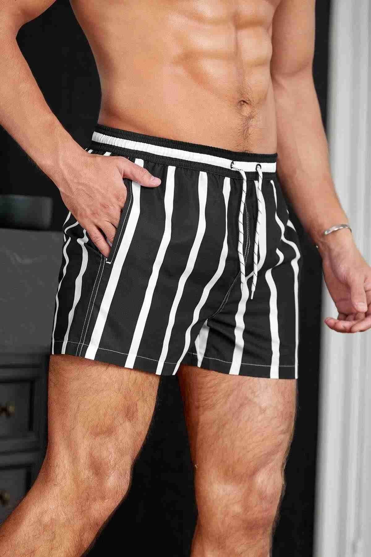 Angelsin Erkek Basic Standart Boy Çizgili Baskılı Mayo Cepli Deniz Şortu Siyah %80 Polyamid, %20 Likra