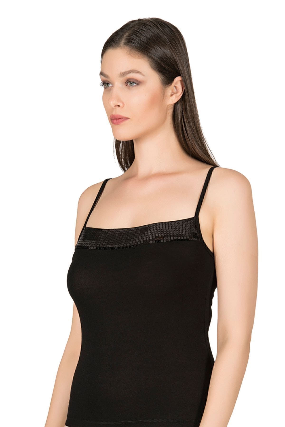 Beyaz, pembe ve bordo renk seçenekleriyle sunulan, ince dokulu, esnek ip askılı kadın atlet. %96 Viscose / Viskon , %4 Elastane / Elastan