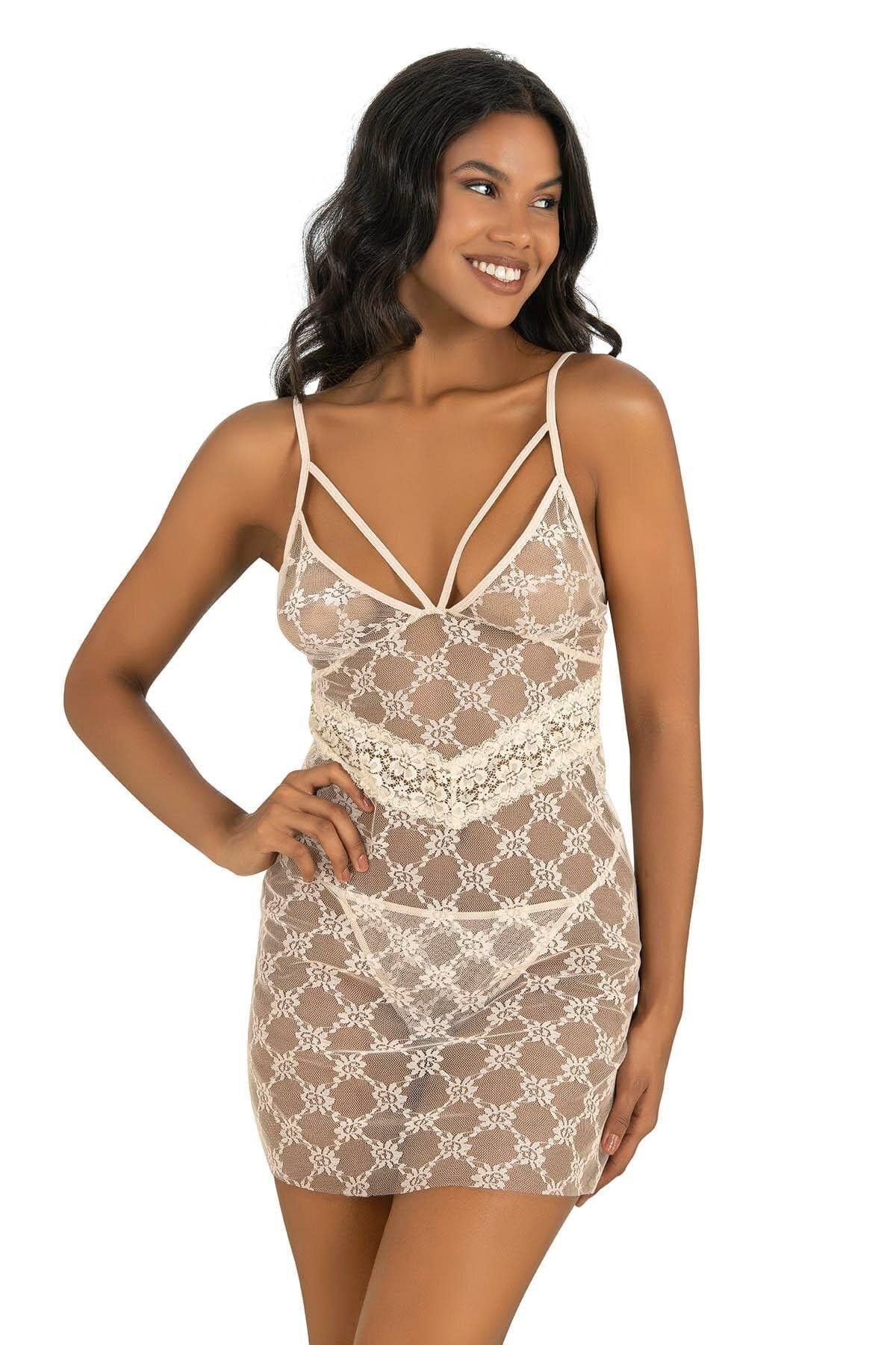 Fildişi tonlarında, şeffaf dantel detaylı ve ip askılı, tek parça kesim gecelik.