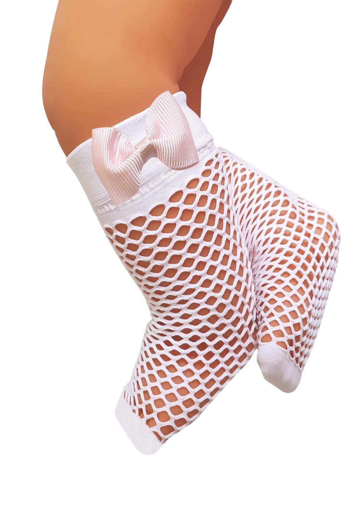 Beyaz renkli, fiyonklu detaylara sahip dizaltı çorap. File dokusu ile şık bir görünüm sunuyor. %87 Polyamide, %13 Elastane
