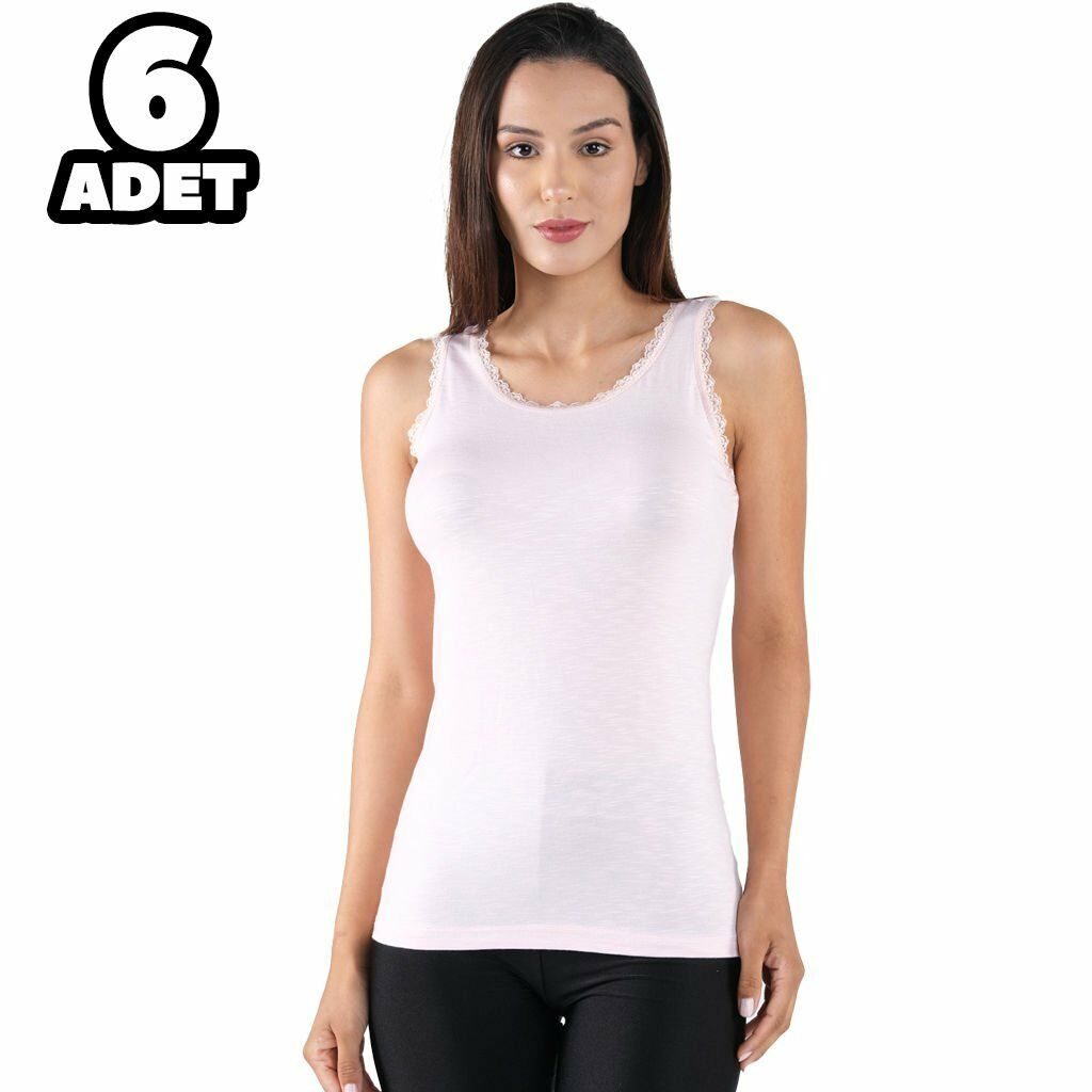 Flamlı kumaş dokusu ve yaka hattında mini dantel kenar detayıyla 6lı paket kalın askılı kadın atlet.