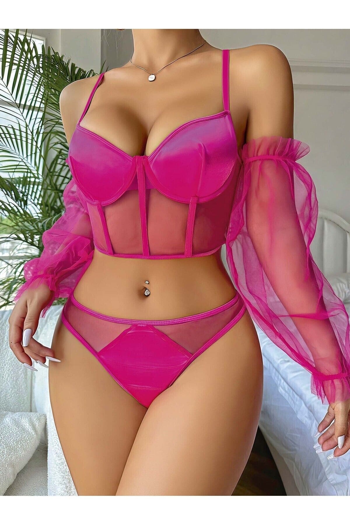 Fuşya renginde, tül detaylı ve tek parça kesim body seti. Esnek kumaşıyla vücut hatlarınıza uyum sağlıyor. %90 Poliamid, %10 Elastan