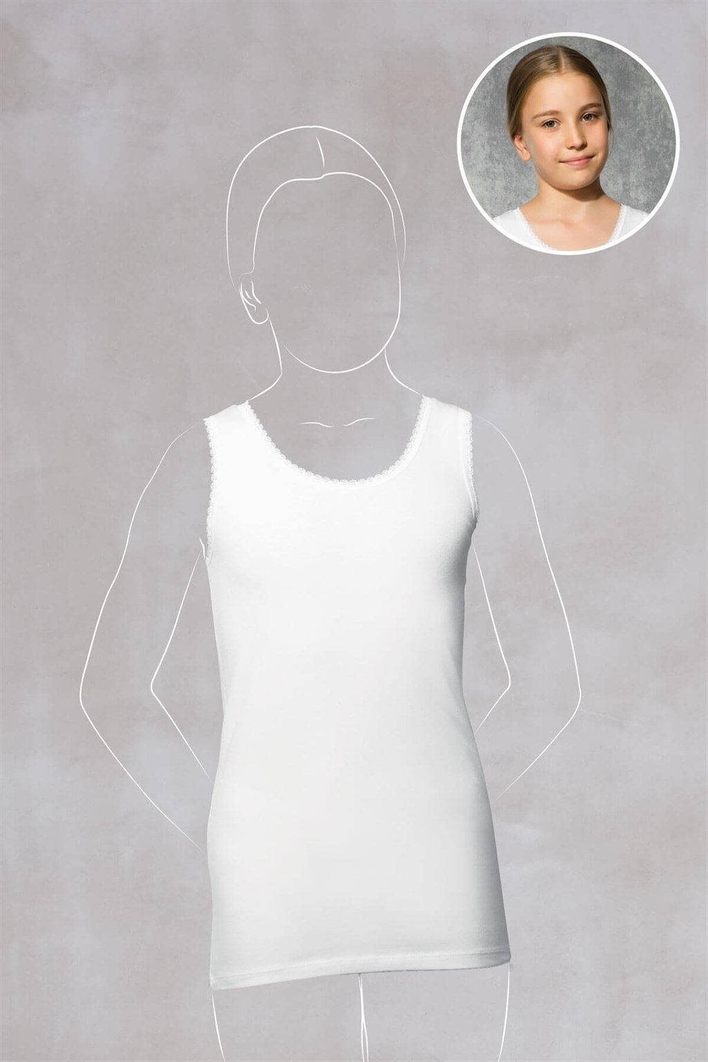 Beyaz renkte, geniş askılı ve pamuklu yapıya sahip kız çocuk atleti günlük kullanım için idealdir. %45 Modal, %45 Pamuk, %10 Elastan