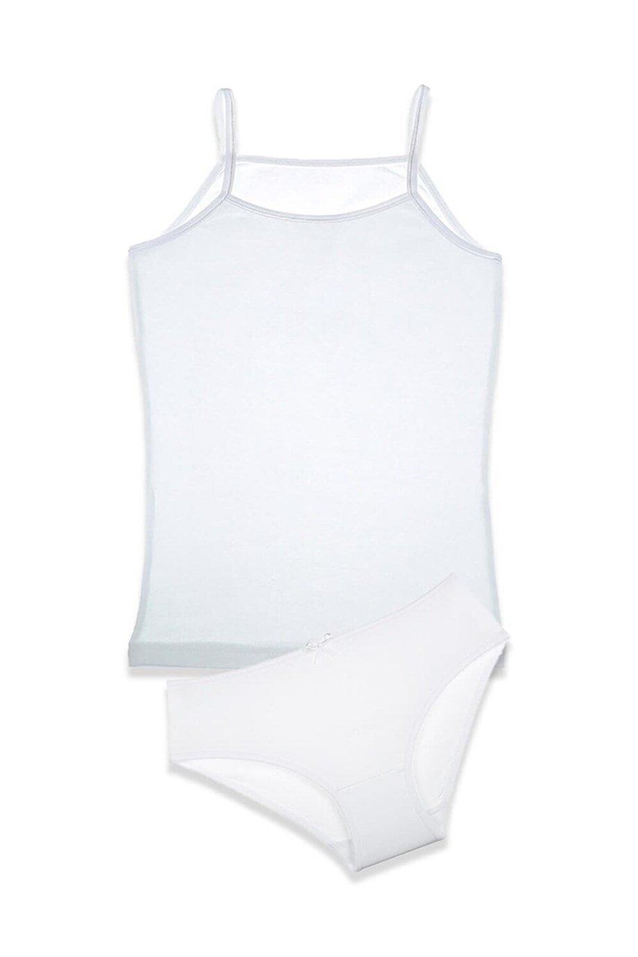 Beyaz, pamuk ribana dokusuna sahip geniş askılı atlet ve uyumlu külottan oluşan takım. %100 Pamuk Ribana