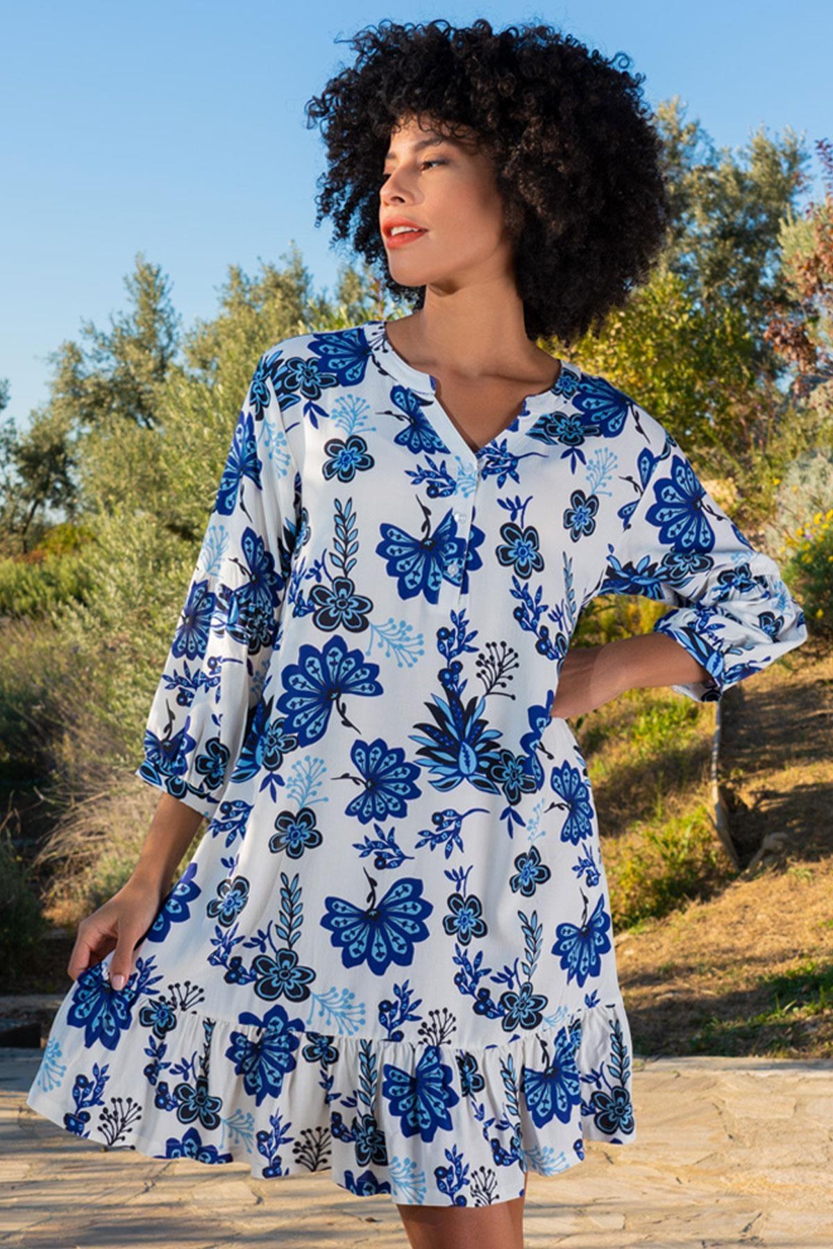 Beyaz zemin üzerine çiçek desenleriyle süslenmiş, geniş kesime sahip kısa elbise.