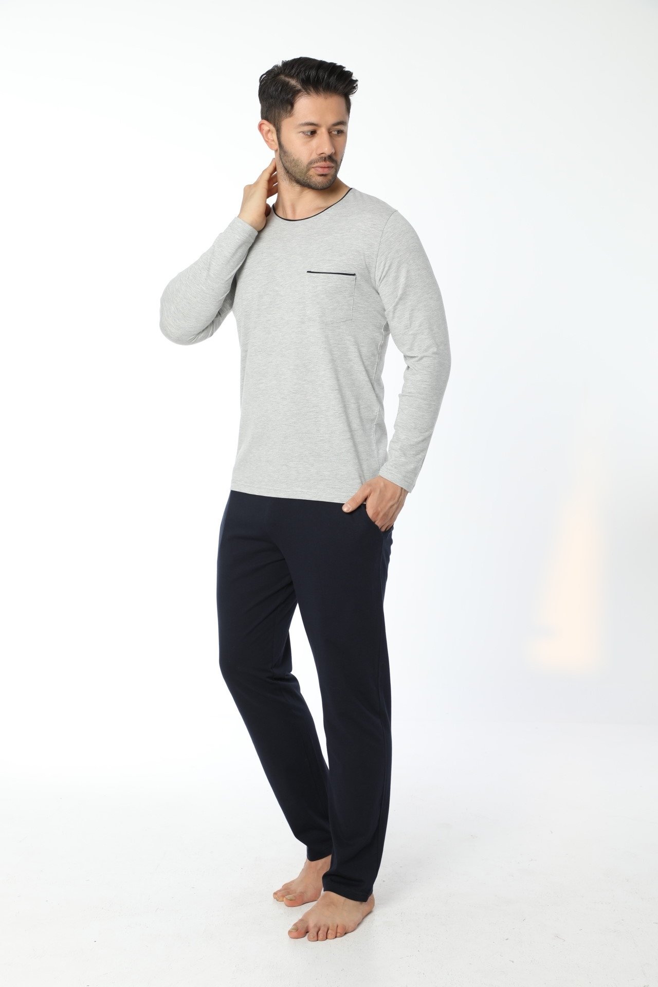 Gri melanj renginde, uzun kollu ve bisiklet yaka tasarıma sahip, rahat bir pijama takımı.
