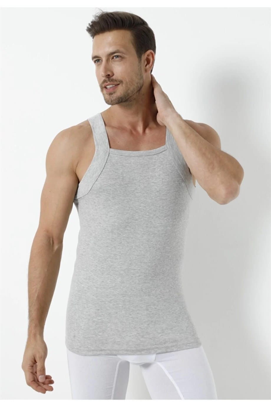 Gri tonlarında, geniş biyeli kesim ve yumuşak pamuk dokusuna sahip erkek atlet. %100 Pamuk