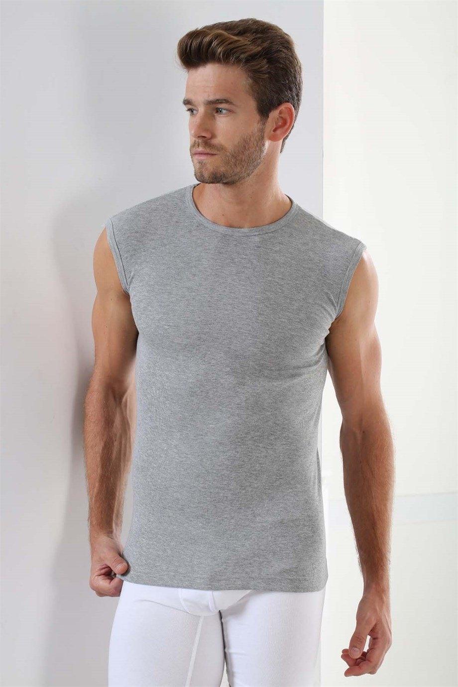 Gri tonlarında, ribana kesimli ve yuvarlak yaka kolsuz atlet, pamuklu yapısıyla konfor sunuyor. %100 Pamuk