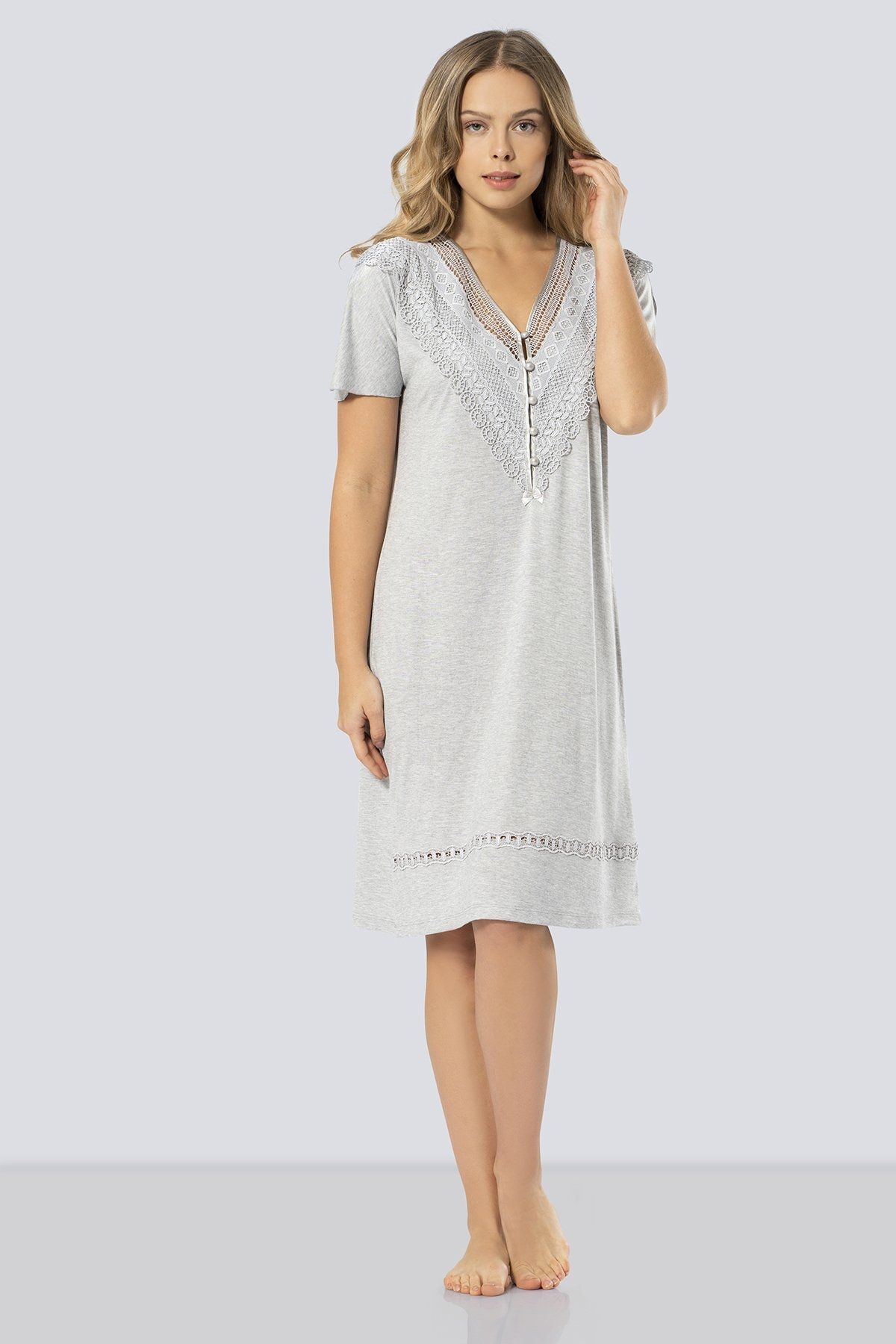 Yumuşak dokusu ile dikkat çeken bu gri gecelik, uyku saatlerinizi daha keyifli hale getiriyor. V yaka tasarımı, boyun bölgesini zarif bir şekilde vurgularken, kumaşın hafifliği sayesinde üzerinizde yokmuş gibi hissediyorsunuz. Bu özellikleriyle, gecelik hem estetik bir görünüm sağlıyor, hem de konforu ön planda tutuyor.