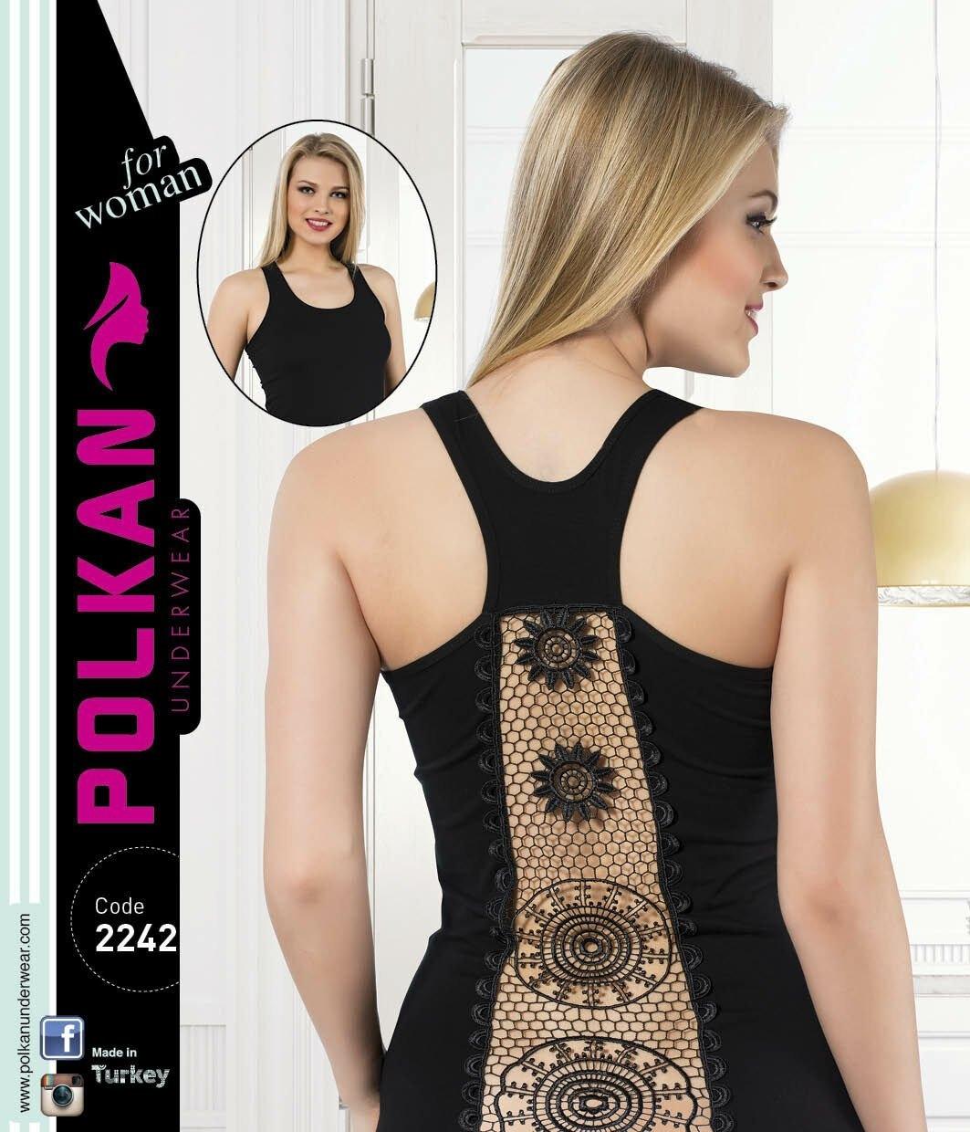 Siyah renk, sırtı güpürlü tasarıma sahip kalın askılı kadın atleti, konfor ve şıklığı bir arada sunuyor.